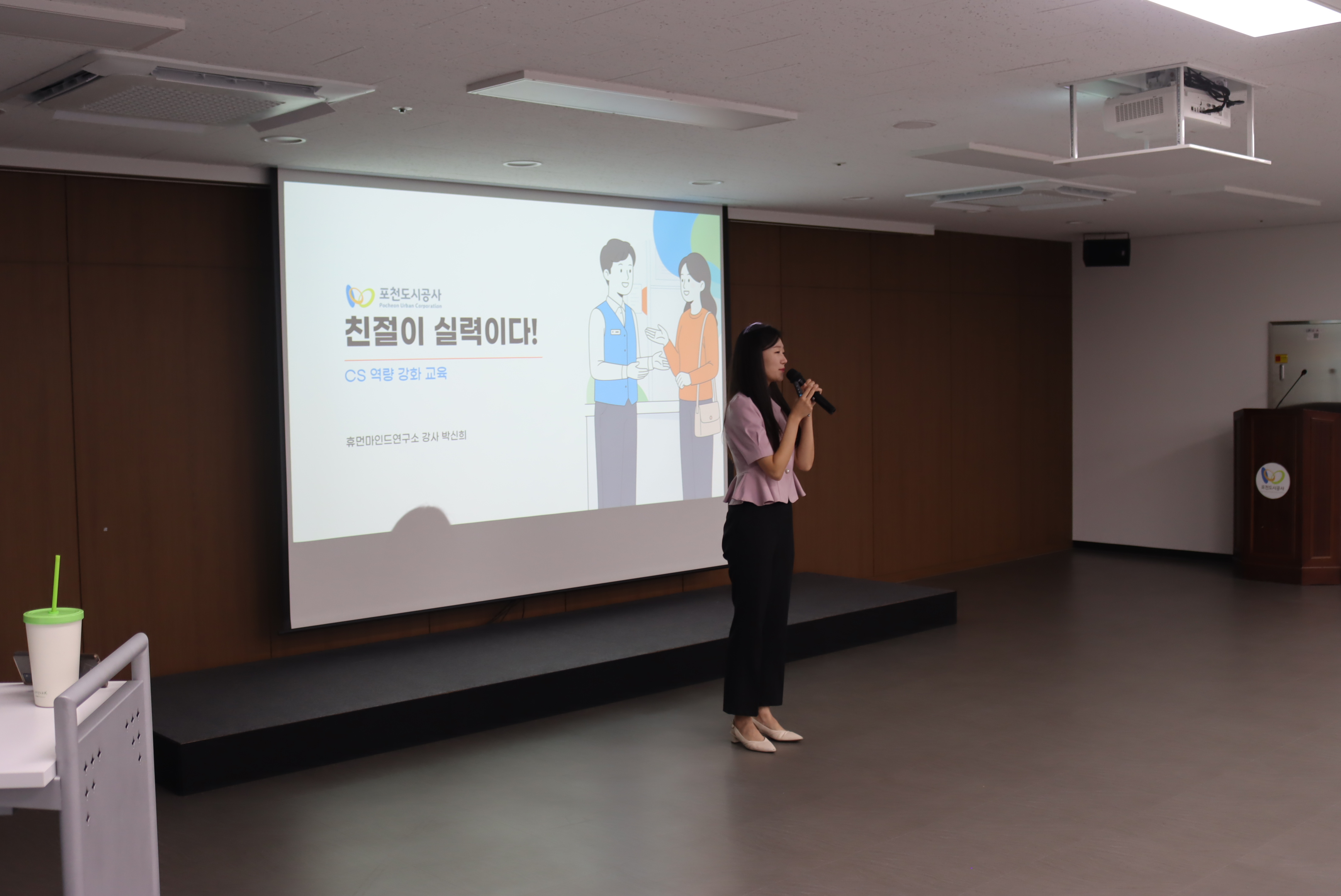 포천도시공사(사장 이상록)는 지난 9월 24일(화) 공사 본청에서 전 직원을 대상으로 CS(고객서비스) 친절교육을 실시했다. 이번 교육은 고객 만족을 최우선으로 하는 경영 철학을 실천하고, 공사의 서비스 품질을 한층 더 향상시키기 위해 마련됐다.