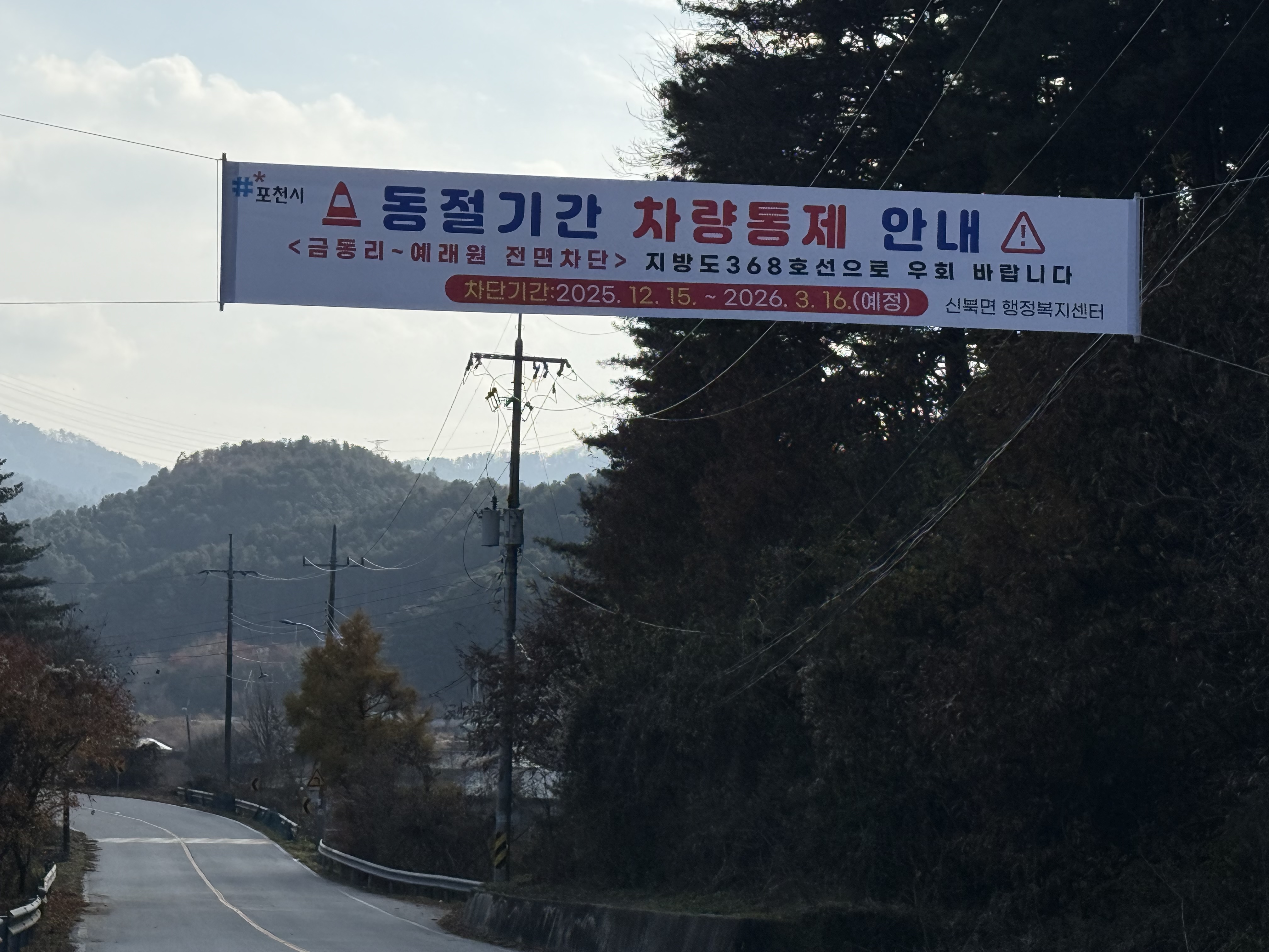 포천시와 포천경찰서는 동절기 잦은 폭설과 상습 결빙으로 인해 차량 미끄럼 사고와 차량 전복 사고가 자주 발생하는 지역으로 2025년 12월 15일부터 2026년 3월 16일까지 차량은 전면 통제됩니다.
