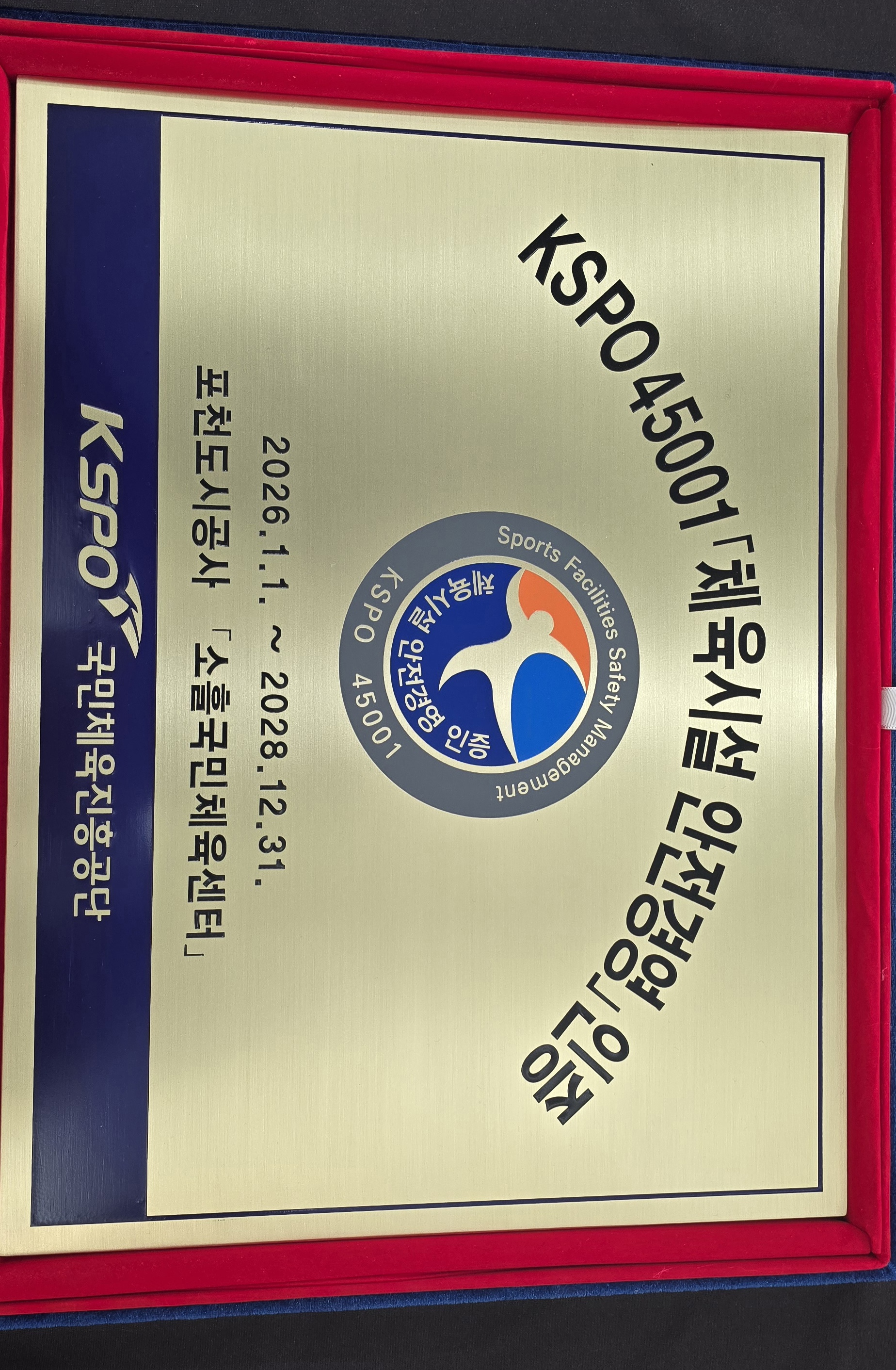포천도시공사(사장 이상록)가 운영하는 소흘국민체육센터가 2025년 12월 10일자로 체육시설안전경영인증(KSPO 45001)을 획득하였다. 본 인증은 국민체육진흥공단에서 주관하여 공공체육시설의 안전관리 체계와 운영 수준을 종합 평가하는 제도로, 포천시 내 공공체육시설 가운데 최초로 인증을 받은 사례이다.
